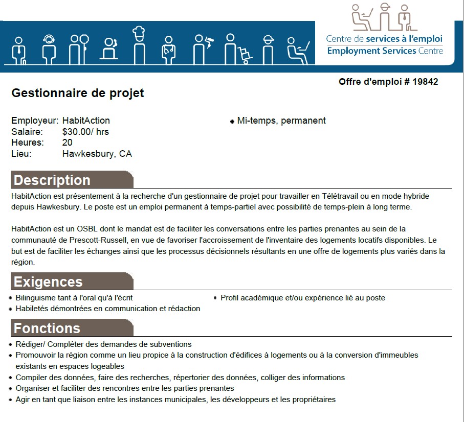 Offre d’emploi à temps partiel avec possibilité temps plein. Idéal pour jeune retraité(e)! Contactez directement le Centre d’emploi de Prescott-Russell: https://www.csepr.ca/?option=com_jobboard&view=job&jobid=19842