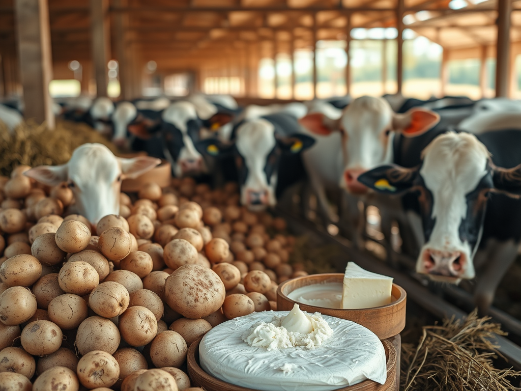 - Incorporation de pommes de terre déclassées dans la ration alimentaire des vaches laitières. Résultats: 50% d’économie sur l’alimentation des vaches, lait plus riche en matières grasses et utilisé pour la fabrication de fromages artisanaux.